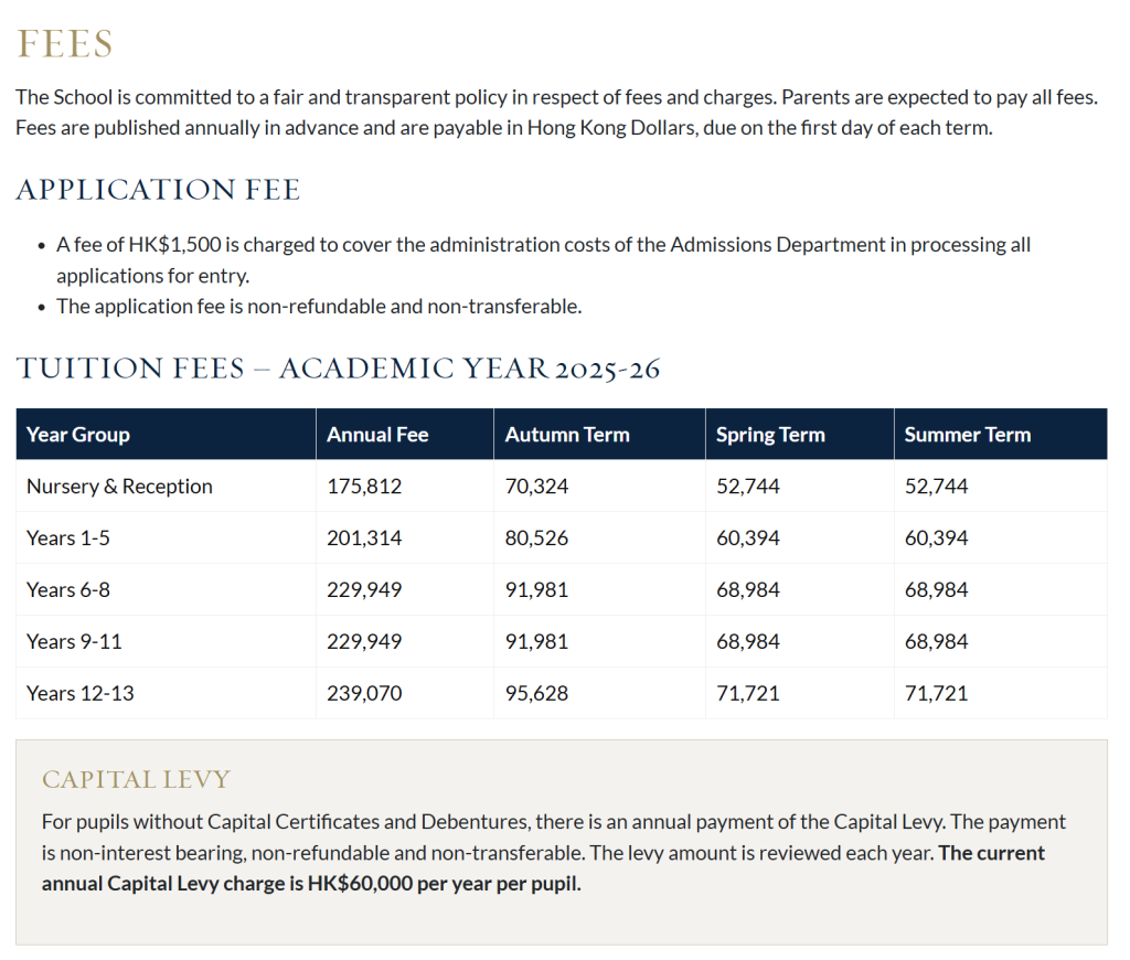 学生入学不需要购买个人资本证书或债券。由于未来不再预计发行个人资本证书和债券,对于没有资本证书和债券的学生,每年需支付资本税。 该支付不计利息、不可退款且不可转让。资本税金额每年会进行审核。目前每位学生的年资本税为港币60,000元。